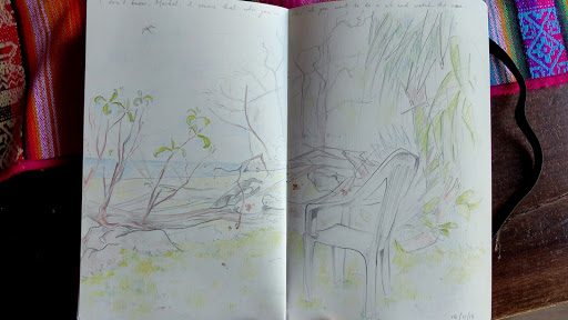 In the far, far north, on the west, west coast, past the great, dark town, down the red, rough track, through the clean, green grass, lies a true blue sea … or rather, the largest ocean on Earth. We’re half a degree of latitude north of the Equator, so far have we come, and behind us is the whole of South America and before us is a stretch of water that spans over 15,000 km unbroken. With a friend, I have escaped the hassle and bustle of Quito to swim and sketch. This is Playa Escondida – meaning hidden beach in Spanish. It’s well-named!