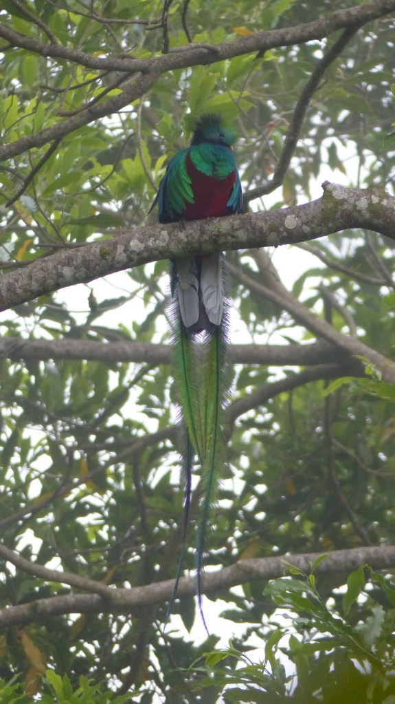 Yo decidí subir Atitlán para aplacar mi curiosidad de observar estas mismas fumarolas, a ver si están tan energéticos como se les dice. No espectaba tanta de la subida, pero me sorprendió la variedad y riqueza de las zonas climáticas que uno pasa por alcanzar la cumbre. El sendero turístico sale de la carretera de Santiago Atitlán por Cocales, empezando un poco antes del mirador del Rey Tepepul. El primer parte del viaje es por pickop, pasando por Panabaj, hasta el área del Biotopo de Rey Tepepul. Fue en este biotopo que Beth y yo y nuestro guía Rolando Toj observamos un baile de quetzales resplendentes. El quetzal es el símbolo más conocido de Guatemala, y le presta su nombre a la moneda también. (Rolando y su compañero Benjamín, con quien subí el Atitlán, son guías del primera calidad: les recomendaría a cualquiera persona que quiere ocuparse de un guía local. Aquí les pueden contactar: BirdZone Atitlán.)