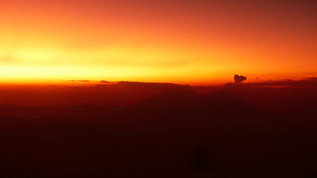 El sol venia al principio poco a poco, y luego de una vez. Contraluz estaban Fuego y Acatenango, y contra las primeras bandas anaranjadas vimos la silueta del volcán ardiendo echando ceniza como su costumbre. El Fuego es una olla burbujeante que nunca cesa.