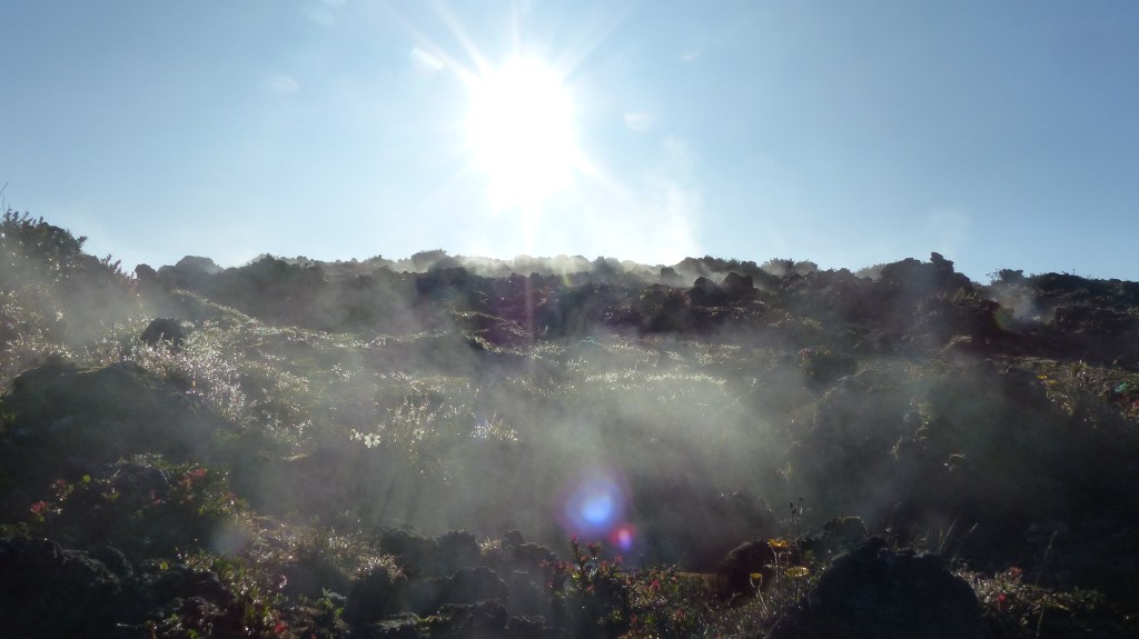 ¿Y de la olla tapada sobre que estábamos parados? ¿Había mucha evidencia de la actividad fumarólica? Por supuesto. Al parte norte de la cumbre, donde empieza el descenso hacia San Lucas Tolimán, hay chimeneas echando vapor con ganas. En la mera cumbre, uno puede apreciar un campo humeante, en donde entre las rocas se abren bocas que echan vapor de aguas y gases volcánicas del interior del volcán. Quizás las flores del monte que rodean estas bocas se alimentaron de este sustento raro.
